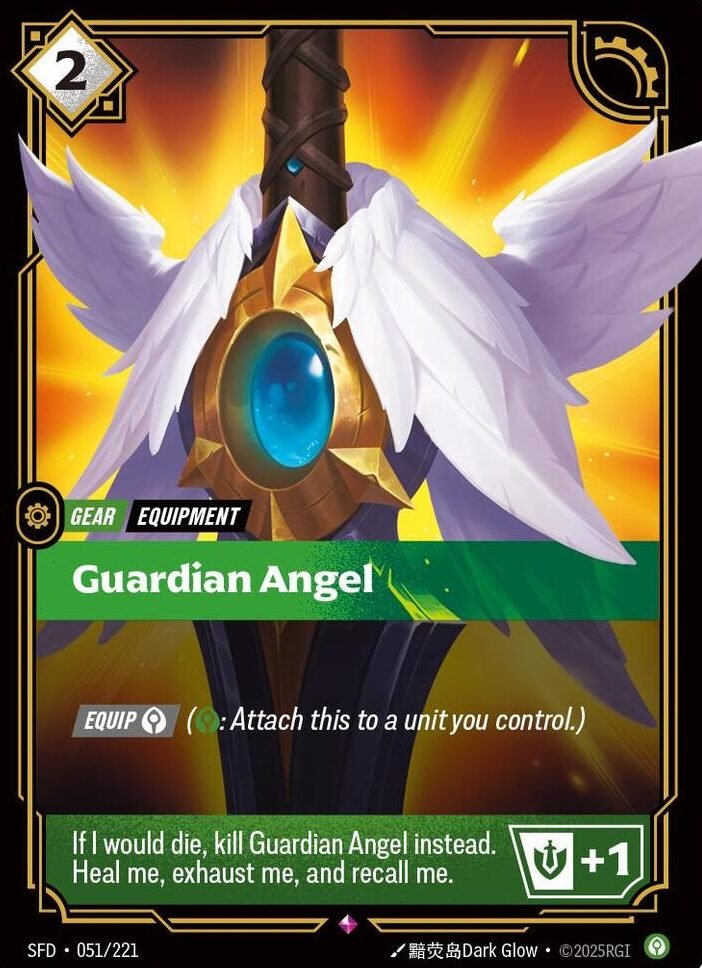 [EQUIP Calm] (Calm: Attach this to a unit you control.) If I would die, kill Guardian Angel instead. Heal me, Exhaust me, and recall me. Might +1