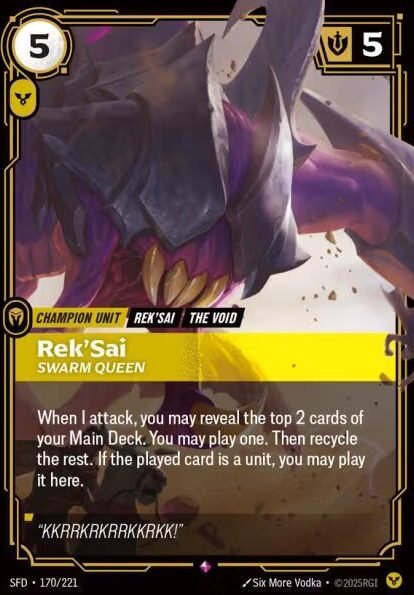 When I attack, you may reveal the top 2 cards of your Main Deck. You may play one. Then recycle the rest. If the played card is a unit, you may play it here.